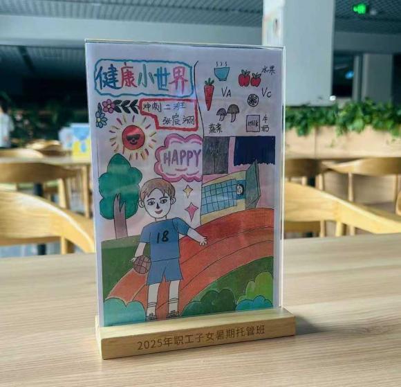 托管班期间,孩子们围绕健康生活、合理膳食、运动健身等主题,绘制的健康主题绘画台卡整齐摆放在医院餐厅,传递健康生活的理念。