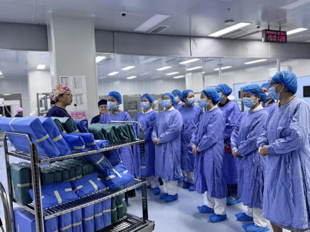 消毒供应中心党支部书记马静带队进入各个区域讲解,依次参观去污区、检查包装灭菌区、无菌物品存放区,全面展示器械回收-清洗-检查包装-灭菌-储存发放闭环管理流程,现场演示压力蒸汽灭菌、低温环氧乙烷灭菌、低温过氧化氢灭菌等核心技术,详细讲解消供人对精密器械的一检二审三包装的查对环节,以及无菌物品的生物监测、质量追溯、院感防控等关键环节。