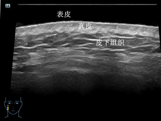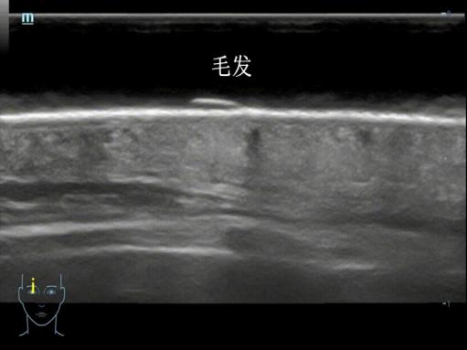 我们的皮肤从外到内分为表皮、真皮、皮下组织三层,就像一层薄外套裹着两层“保暖层”。在超高频探头下,薄薄的皮肤可以变成一张 “皮肤剖面图” ,不仅可以看到表皮、真皮、皮下组织的结构,精确测量其厚度,还可以清晰显示其内的毛发、毛囊、皮脂腺等肉眼及普通超声无法识别的结构。