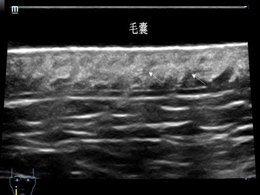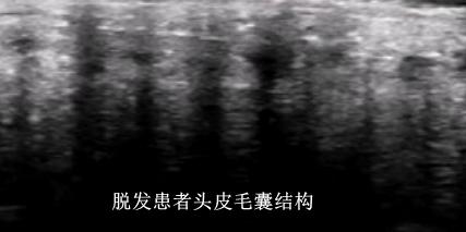 超高频超声可以显示头皮毛囊密度及毛囊状态,正常人的毛囊密集、排列整齐,脂溢性脱发患者毛囊间距增宽,斑秃显示毛囊稀疏、排列杂乱。超高频超声可以为治疗选择、疗效评估及随访监测提供量化工具。