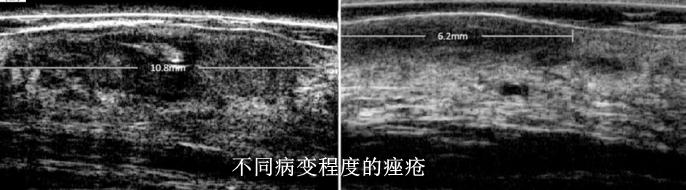 比如皮肤长了肿瘤,用超高频超声一看,就能知道病灶长在皮下哪一层、与周围血管、神经的毗邻关系,手术时怎样才能避开血管和神经。还有人得了“湿疹”“皮炎”,虽然临床诊断相对容易,但超高频超声能显示出真皮层有没有水肿、炎症范围有多大,帮助医生判断病情轻重,还能跟踪治疗后炎症是不是在消退。甚至像一些肉眼无法观察的部位,比如 “灰指甲”,超声也能穿透指甲,看看甲板下有没有真菌破坏的空洞。