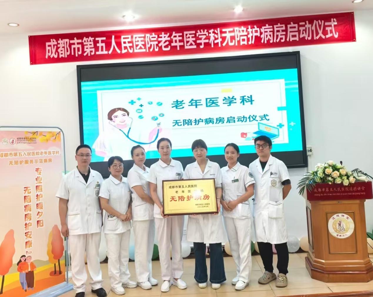 2025年9月16日,成都市第五人民医院举行了老年医学科"无陪护病房"启动仪式暨揭牌活动。本次活动以"专业照护暖夕阳,无陪护病房护安康"为主题,院领导、护理部、老年医学科医护人员及护理员共同见证这一新型照护模式正式落地。