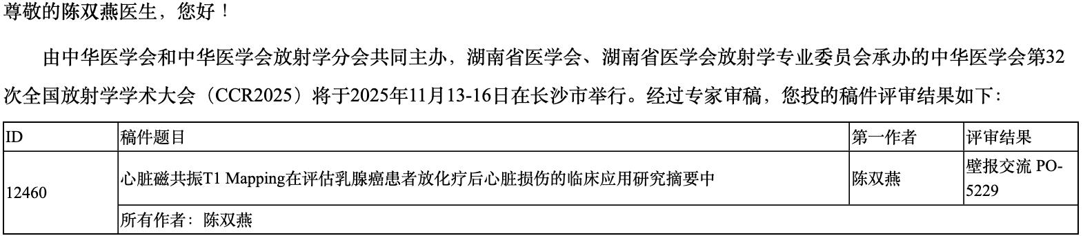 2025年11月13日-11月16日,医学影像界瞩目的中华医学会第32次放射学学术大会近日在长沙开幕,成都市第五人民医院放射科团队5篇论文获壁报交流,2篇论文获书面交流,充分展示成都市第五人民医院放射科在相关方向研究的深厚实力。