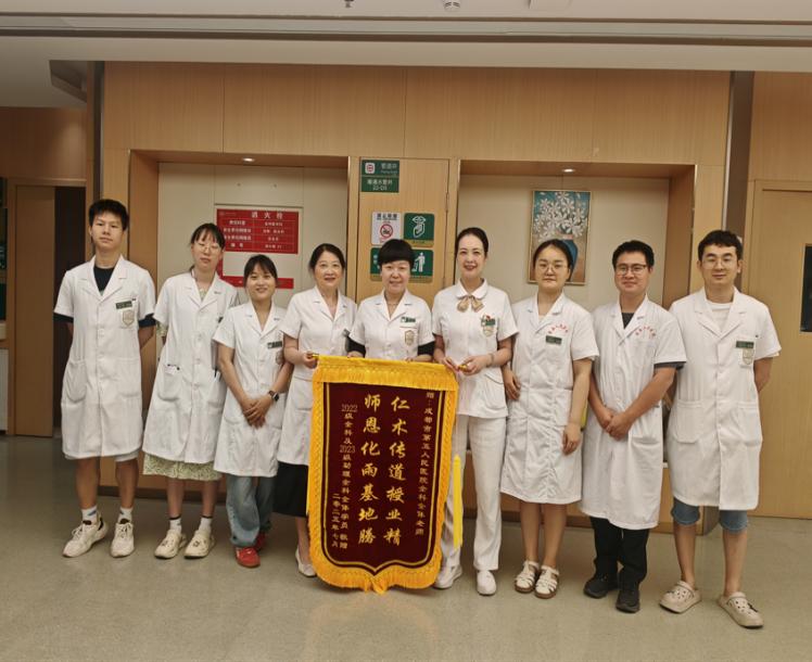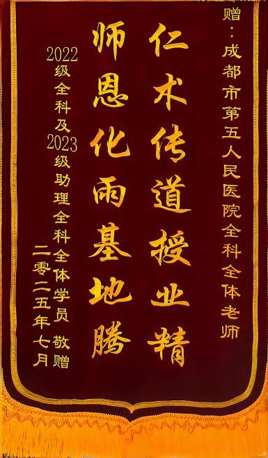 2025年7月,成都市第五人民医院全科医学科规培基地2022届学员代表向导师团队赠送锦旗致谢。锦旗题词"仁术传道授业精,师恩化雨基地腾"彰显了学员对导师悉心培养的感激,也体现了对基地教学工作的充分肯定。